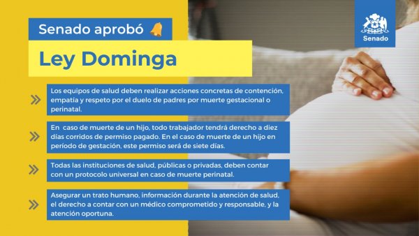 La ley dominga, incorpora dentro de los derechos y deberes de los pacientes la realización de acciones concretas de contención, . Avanza ley dominga sobre acompañamiento a padres que sufrieron muerte gestacional. Acompañar a las familias en la muerte de bebés en gestación, acogerlos y contenerlos. Tras la promulgación de la "ley de acompañamiento y atención en caso de pérdida gestacional o perinatal", el delegado presidencial de . Norma se conoce como ley dominga: